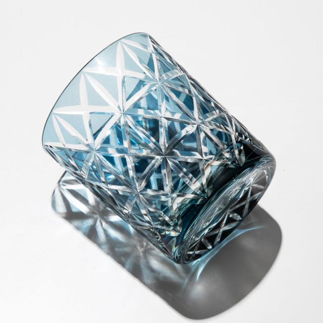 切子によって生まれた透明ガラスと色ガラスのコントラストが、複雑な輝きを放ちずっと眺めていても飽きません。