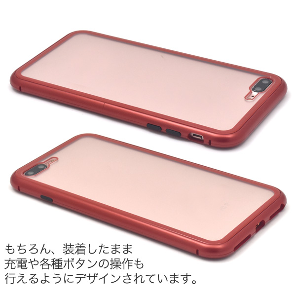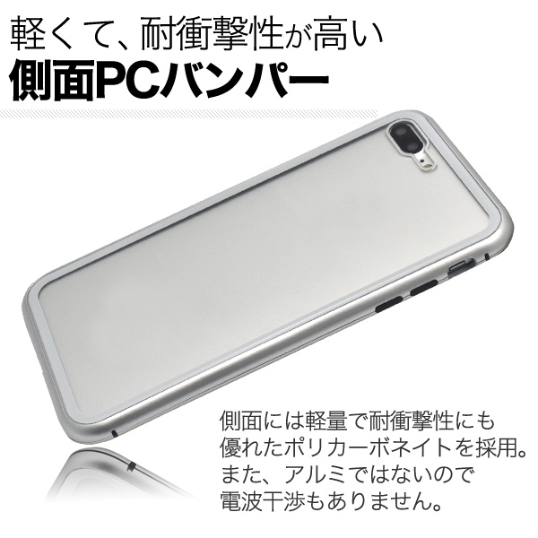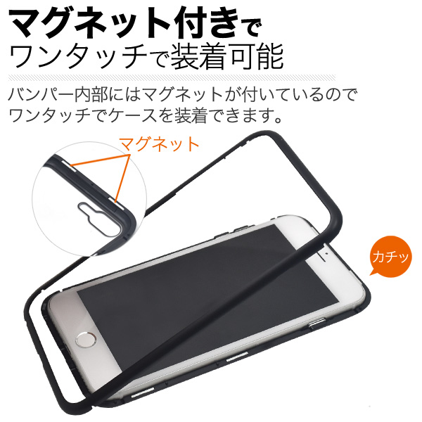 背面強化ガラス+側面PC設計のガラスバンパーケース。傷が付きにくく、強力な強化ガラスを背面に採用。また、透明度も抜群なので、iPhone本体の光沢感もそのまま楽しめます。 側面には軽量で耐衝撃性にも優れたPC(ポリカーボネイト)を採用。また、アルミではないので電波干渉もありません。バンパー内部にはマグネットが付いているのでワンタッチでケースを装着できます。もちろん、装着したまま充電や各種ボタンの操作も行えるようにデザインされています。
