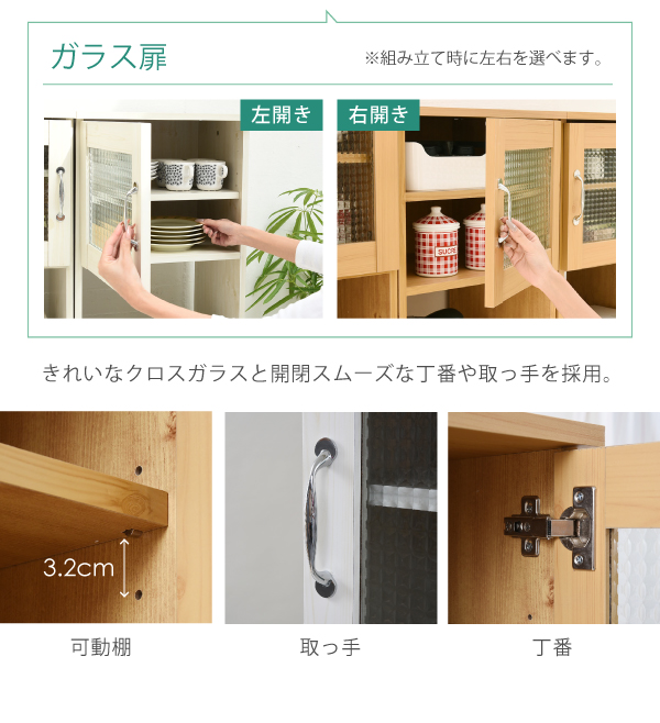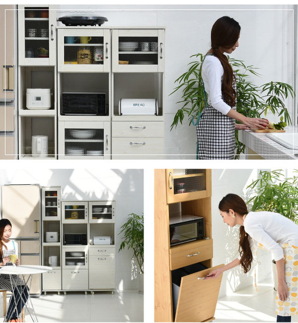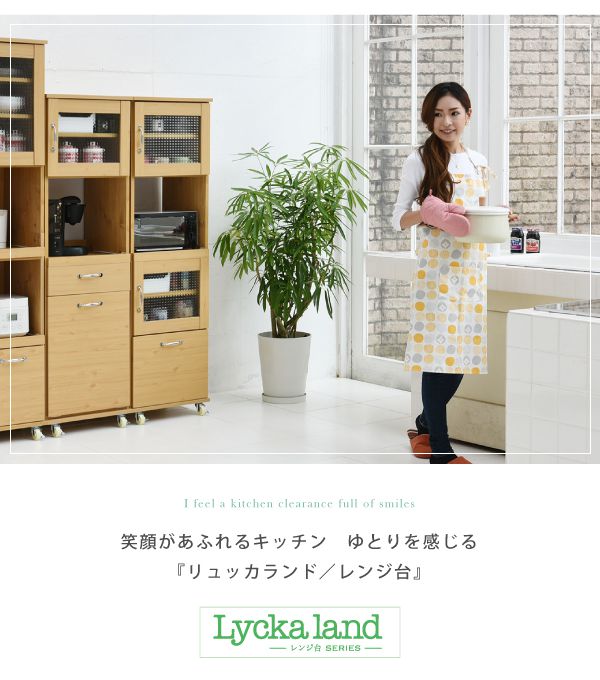 木目調とガラスのカントリーテイストが可愛いリュッカランドのキッチンシリーズ。斜め開閉の下部には付属のペールが2つ収まる収納部を完備!ゴミの分別もばっちり。