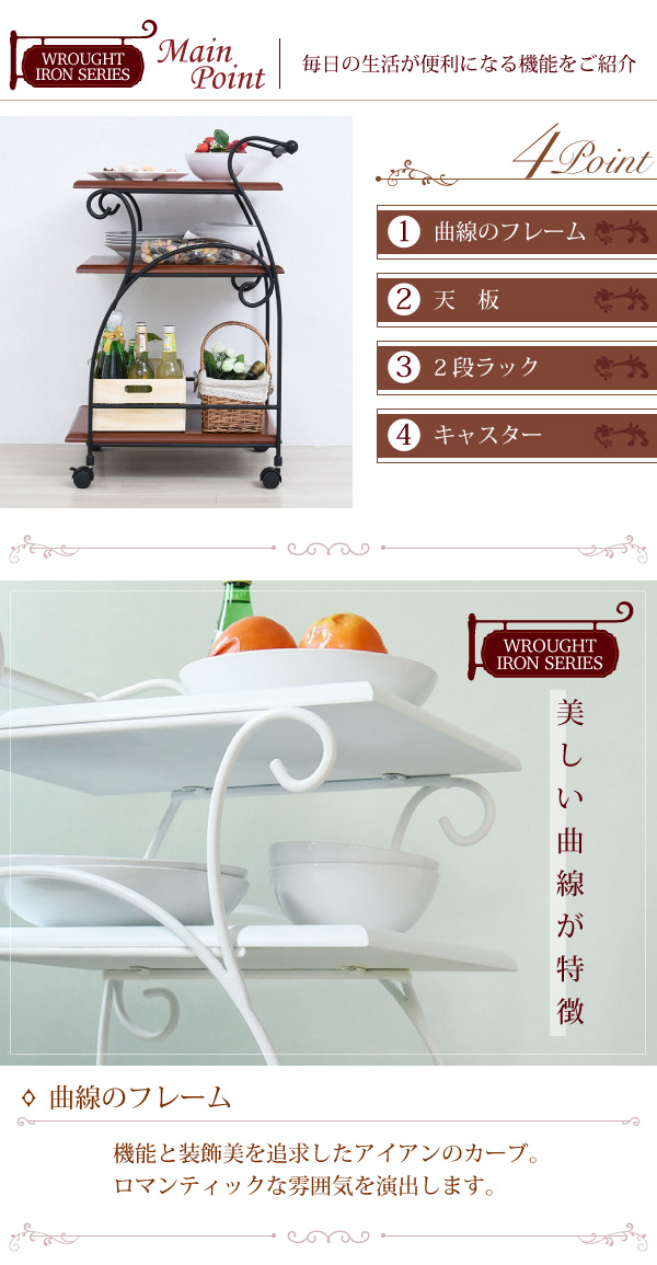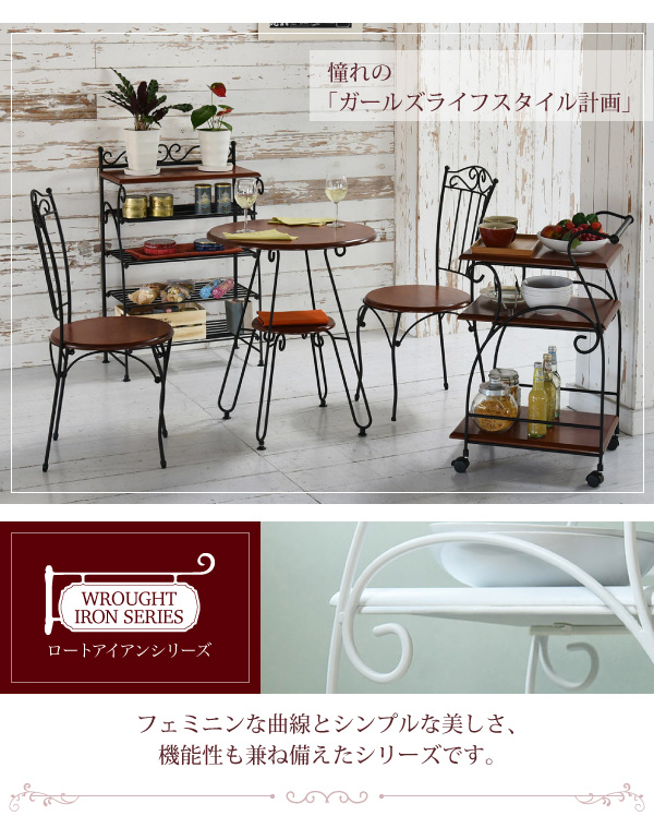 ダイニングテーブルと揃えてヨーロピアンなお部屋を作る女性らしいアイテム。キャスターにはロックが付いているので、お料理を運ぶとき以外でもキッチンラックとしてご使用いただけます。