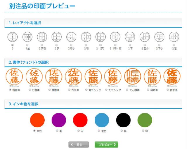 書体:楷書、古印体、隷書、行書、明朝体、角ゴチック、丸ゴチック、てん書が選べます。