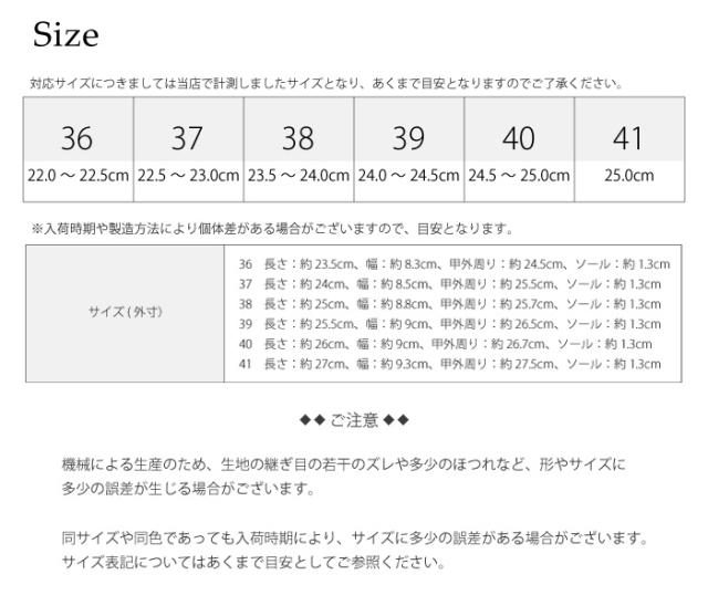 36:22.0〜22.5cm、37:22.5〜23.0cm、38:23.5〜24.0cm、39:24.0〜24.5cm、40:24.5〜25.0cm、41:25.0cm