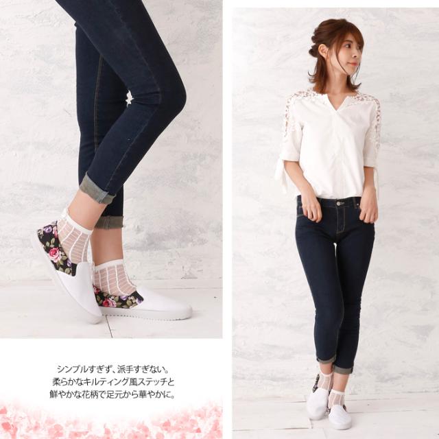 キルティング風のステッチに上品な花柄で足元から華やかに。