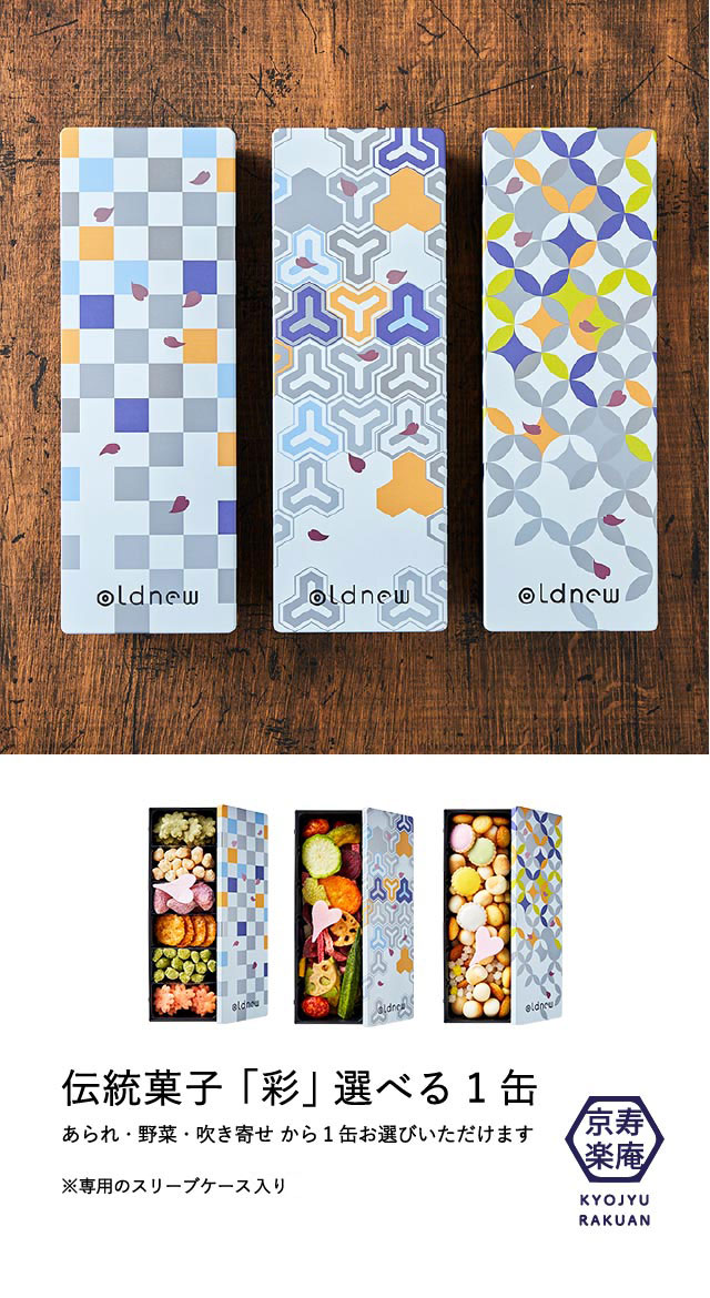 懐かしいのにどこか新しい日本伝統菓子の詰合せ、その名も「OLD NEW」。あられやボーロといった昔なつかしい日本のお菓子を、日本の伝統柄を近代風にアレンジしたデザイン缶に詰めました。味わいも彩りも豊かな、ひとくちサイズの昔菓子たち。現代のデザインと日本の伝統菓子がミックスした、にほんの昔菓子の新提案です。