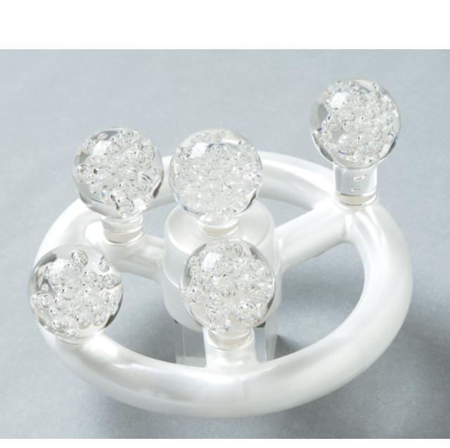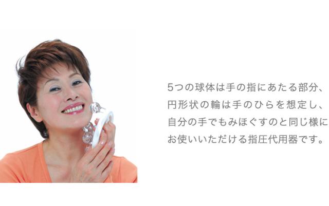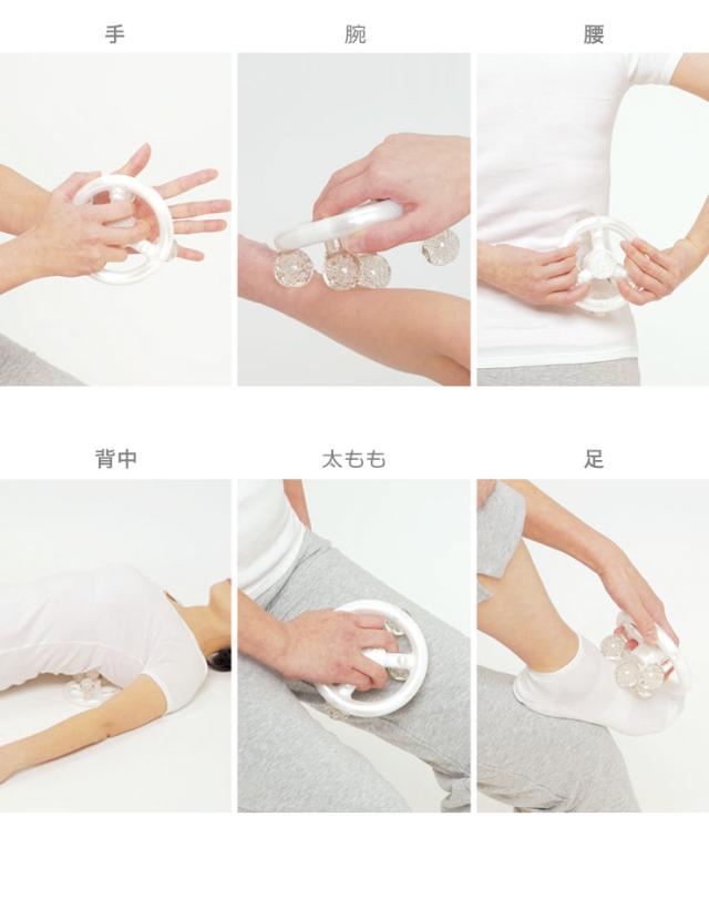 ●5つの球体は手の指にあたる部分、円形状の輪は手のひらを想定し、自分の手でもみほぐすのと同じ様にお使いいただける指圧代用器です。