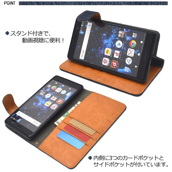 デニムデザインの手帳型ケース。 衝撃やキズなどからスマホを守ります。 内部ケースはソフトケースなので、着脱が簡単です。 男女どちらでもお使いいただける、スタイリッシュなデニムデザイン。 内側は落ち着いたレザーデザインです。 落下防止に便利なストラップホール付きです。 横開きタイプなので、手帳のように使うことができます。また、内側に3つのカードポケットとサイドポケット付きです。※スマートフォンは付属しません。※ライセンス商品ではありません。 ※ケースをつけたまま撮影できますが、フラッシュ撮影時にケースの色が移り込むことがあります