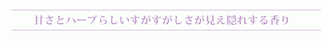 すっきりとした中に、甘さとハーブらしいすがすがしさが見え隠れする香りです。甘さ控えめな香りで女性だけでなく男性にも好かれる香りです。