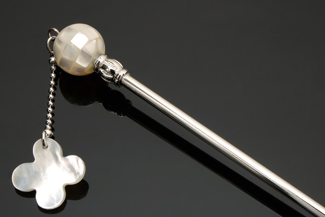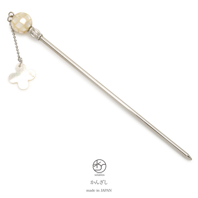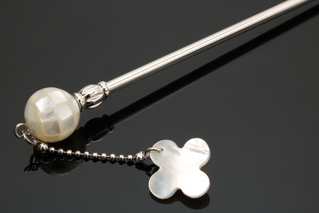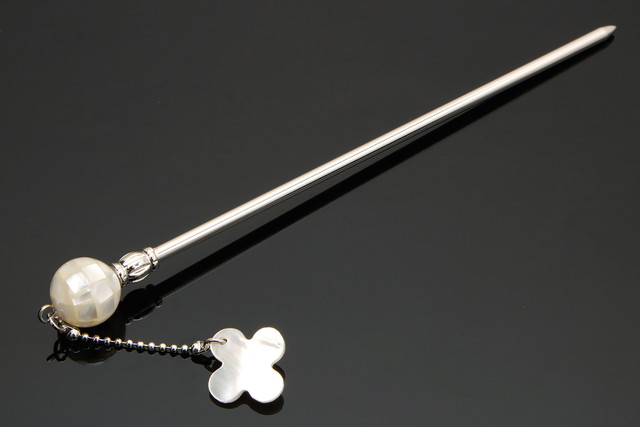 シルバーの簪に、白乳色の貝殻を張り込んだ美しい飾りが施され、同じ素材で花形のぶら飾りがデザインされた可愛らしい印象です。