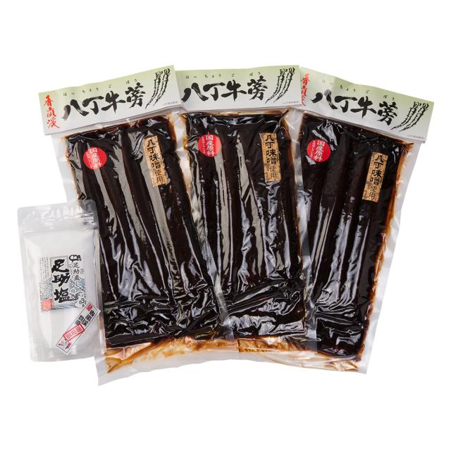 【数量・内容】八丁牛蒡(山ごぼう味噌漬)270g×3袋、足助直し足助塩200g×1袋