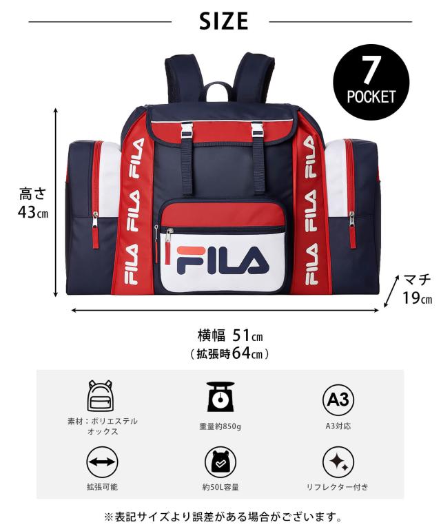 【期間限定セール】FILA フィラ リュック リュックサック 大容量 サブリュック 林間学校 50L 修学旅行 バッグ 男の子 女の子 おしゃれ 旅行バック バックパック キャンプ キャンパス 防災リュック キッズバッグ outfit ポイント消化