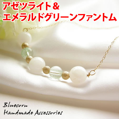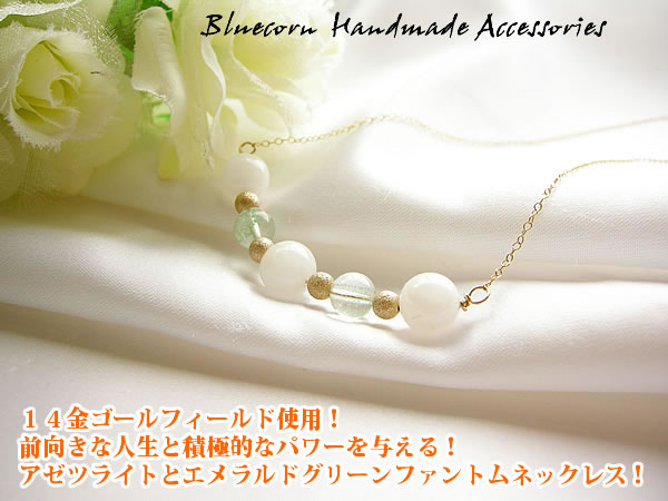◆14金ゴールドフィールド使用! 前向きな人生と積極的なパワーを与える!アゼツライトとエメラルドグリーンファントムのネックレスです! ●アゼツライトについて 数アゼツライトは、水晶の新種のひとつで、アメリカのノースカロライナ州、バーモント州、インドのサチャロでしか 産出されていない、貴重な水晶のひとつとされています。また、ニューエイジやヒーラーの方々の間では、珍しい、光を発するクリスタル(水晶)とされており、純粋で高度な波動を持つ石と言われています。持つ人の意識や波動を、より高いレベルまで引き上げ、また、他の人を助けるためにポジティブな波動を創り出してくれるパワーストーンでもあり、その最も高い波動のエネルギーから、思い通りの人生を叶えてくれる水晶とも言われています。 ●エメラルドグルーンファントムについてマダガスカル産のエメラルドグリーンファントムは、透明度の高い清らかな水晶に、色彩も形状も美しいグリーンのファントムがクリアに浮かび上がる、希少性の高い石のひとつとなっています。これまでにない、明るいミントグリーンの色をしているのが特徴で、ネガティブなエネルギーを浄化し、回りのエネルギーをプラスのエネルギーに回復させる力があると言われています。人生においての壁や困難を乗り越えて、次のステージへ成長するための明確なビジョンを与えてくれるとも言われています。