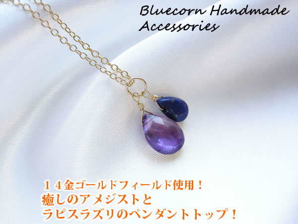 ●14金ゴールドフィールド使用! 癒しのアメジストと幸運を招くラピスラズリのペンダントトップです! ●アメジストについて 「紫水晶」として人気の高いアメジストは、調和と安定を表すパワーストーンで、 人間関係の調和や家庭円満などいつも心を穏やかに調和の心を保つための サポートをしてくれると言われています。 また、アメジストには、癒しと安らぎを与えてくれる優しいいエネルギーを持ち、 不安やストレスを和らげてくれるパワーを与えてくれるとも言われています。 ●ラピスラズリについて 幸運を招く石として有名なラピスラズリは、外からの悪いエネルギーを寄せ付けない力を持つために、 持ち主の心の状態を浄化しながら内面の問題解決に役立つパワーストーンと言われています。 その人の日々の成長のためにに、本人にとってとても大切で重要なことに焦点をあてて改善してくれるので、 成長するために必要な直感力や判断力を鋭くしてくれます。 そのため、表面的にはその人が望んでいないようなことが起こったとしても、 後から振り返ると必要必然だったようなことだったとわかったり、それが自分の正しい道へと前進して いくことにもつながることによって、結果として最高の幸運を呼び寄せることにつながっていきます。 ラピスラズリにはそのような深い大きな力が宿っているため、昔からずっと重宝され、 現在でもとても人気の高いパワーストーンです。 宇宙につながる石でもあり、あなたにとって本当に必要な幸福を引き寄せるためのパワーストーンです。