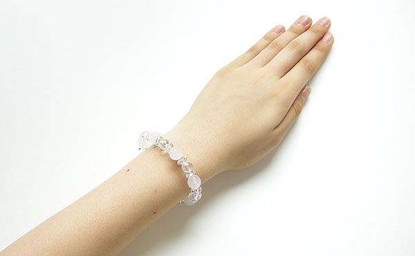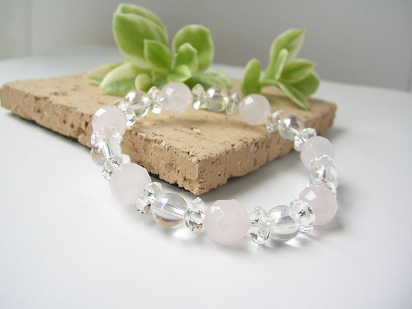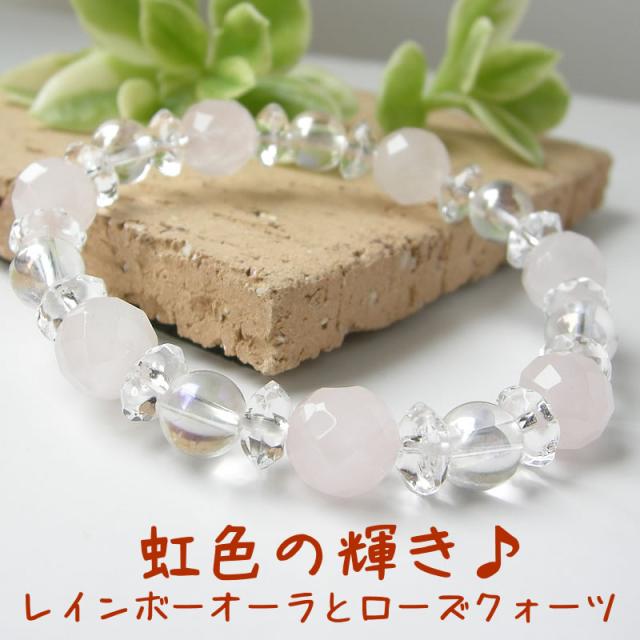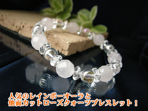 ●宇宙の神秘的な輝き!レインボーオーラと 多面カットローズクォーツブレスレット! レインボーオーラとローズクォーツについて ●レインボーオーラ ひと目見ると、思わず引き込まれてしまう♪そんな素敵なレインボーオーラストーンです。 レインボーオーラとは、真空の中で電熱線を使用することにより蒸発させた金を人工的に水晶の表面に付着させたもので、天然の色あいのものではありませんが、金を蒸着させていることで、水晶のエネルギーも一段と高くなっており、パワーもとても強くなっていると言われています。 この素敵なレインボーオーラは、特にアメリカのヒーラーなどの間では、とても人気の高い石のひとつです。スピリチュアルな雰囲気をたっぷりと持った素敵なパワーストーンです。 ●ローズクォーツ ローズクォーツは、古来、愛と美の女神ヴィーナスのパワーを宿したストーンと言われ、恋愛成就のお守り石として有名です。 また、心に満足感と平和を得ることが出来るストーンとも言われ、実際ローズクォーツのストーンを持っていると優しいエネルギーが流れて、癒しのひと時を与えてくれます。