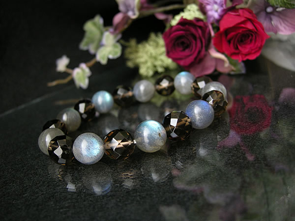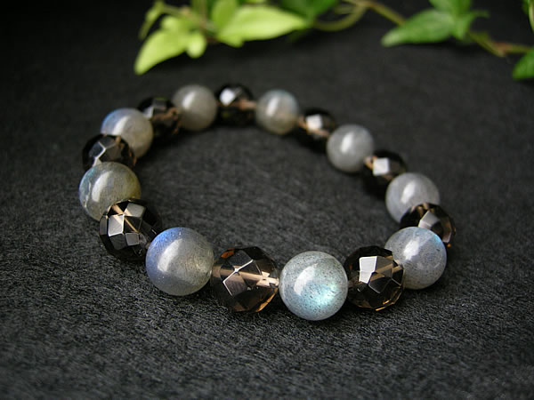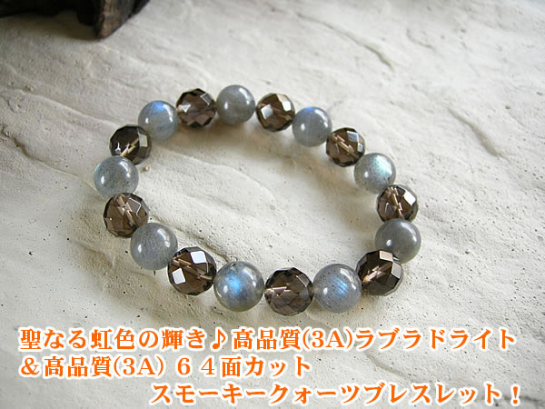 虹色の輝きが現れる聖なる石! 高品質(3A)ラブラドライトと 高品質(3A)64面カットの スモーキークォーツブレスレットです! 石の表面に虹色の輝きが現れる、 神秘的なパワーストーンのラブラドライト。。 昔から、聖なる石と言われ、宇宙とのつながりを 持つ石と言われ、とても大切にされてきました。 ラブラドライトは信念を貫く力を強くし、 根気や持続力を養うとも言われており、 また、直感力や洞察力を高めてくれると 言われています。 また、願いを込めると成功へと導いてくれる石 と言われている、スモーキークォーツは、 自分自身では気がつくことがない潜在能力を 引き出してくれる石で、目標を達成したいときなどに、 願いを込めながら、この石を身につけていると 成功へと導いてくれると言われています。 不安な心や恐怖、ストレスなどを取り除き、 心をリラックスさせ、強い精神力を与えてくれるとも 言われています。 今回もぜひ!ラブラドライトとスモーキクォーツを のブレスレットをどうぞお楽しみくださいませ。