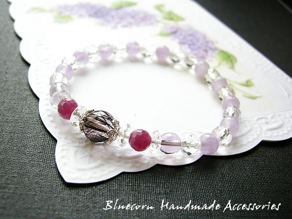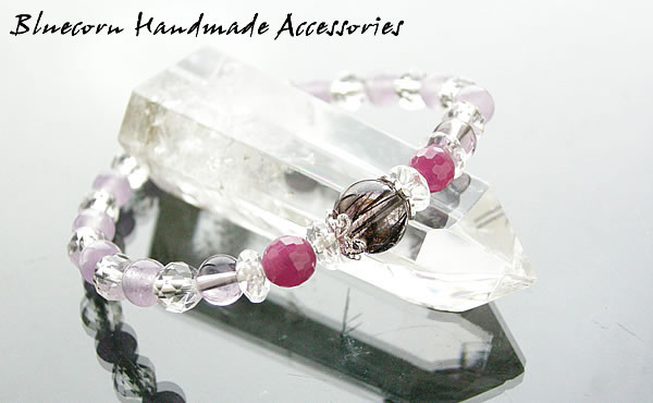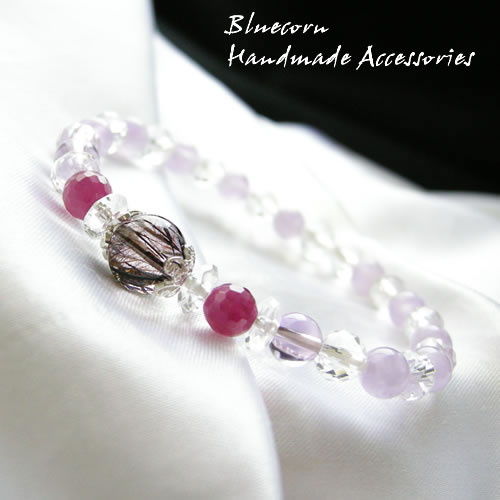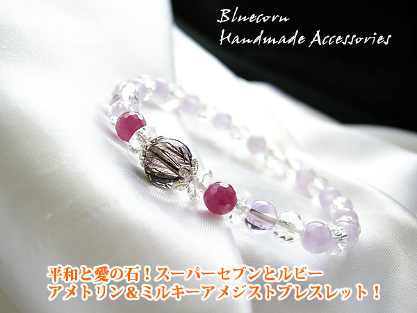 平和と愛の石!スーパーセブンとルビー、アメトリン&ミルキーアメジストのブレスレットです!●スーパーセブンについてスーパーセブンは、アメジスト、スモーキークォーツ、ルチルクォーツ、ゲーサイト、レピドクロサイト、カコクセナイト、クリアクォーツの7種類の石の性質を持ち合わせている石で、地球と地球上に存在するすべての生命の波動を上げ、平和と安心感、連帯感を与えてくれる石と言われ、愛と調和の石と言われています。また、宇宙レベルでの創造性を発揮して、自ら進む道を決めるサポートをしてくれる石とも言われています。世界中のヒーラーやチャネラーから注目を集めるスーパーセブンは、私たちが、地球や惑星から生まれた子供のような存在であることをあらためて気づかせてくれるパワーストーンと言われています。 ●ルビーについてルビーはあらゆる災難から身を守り、平和な生涯を与えてくれる石と言われ、また、勇気と自信を深め、持ち主の能力を最大限に生かしてくれる石とも言われています。 ●アメトリンについてアメトリンは、2種類のパワーストーンアメジストとシトリンが混ざりあった不思議なパワーストーンです。ほんのりとした色合いが、とても魅力的な雰囲気を持つアメトリンは、自分の才能を最大限に引き出してくれるパワーストーンであり、また、アメシストとシトリンの両方のパワーを兼ね備えていますので、とても暖かいエネルギーを持ち、未来への新しい光を見いださせてくれるストーンとも言われています。 ●アメジストについて美しい紫色をしたアメジストは精神を安定させてリラックスした気分にし、癒しと安らぎを与えてくれるパワーストーンと言われています。古代、王様達が競って身につけたストーンで直観力や感受性を冴え渡らしてくれるとも言われています。