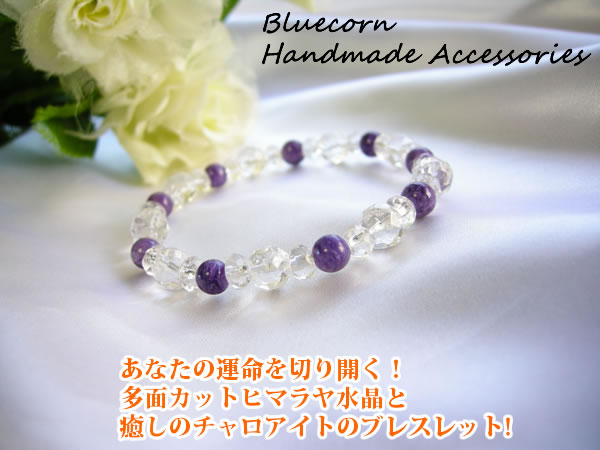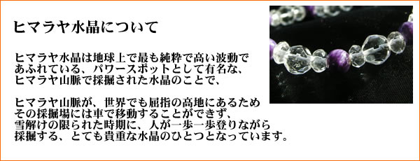 | あなたの運命を切り開く!「神々が住む山」として崇められているヒマラヤで算出された 多面カットヒマラヤ水晶と世界3大ヒーリングストーンのひとつ! チャロアイトを組み合わせたブレスレットです! ●ヒマラヤ水晶について 聖なる「神々が住む山」として崇められている聖地ヒマラヤは、昔から多くの人々に崇められ、 とても高い霊力があるパワースポットとされています。 その聖地ヒマラヤで長い年月をかけて成長してきた、このヒマラヤ水晶は、 地球上で最高のパワーを持ったクリスタル(水晶)のひとつと言われています。 たくさんの大地のエネルギーをもらいながら成長していくクリスタルにとって、 その場所のエネルギーというのは最も大切な要素のひとつですが、 ヒマラヤ山脈は地球上で最高のパワースポットのひとつと言われていますので そのクリーンなエネルギーがいっぱいつまった、 まさに、「ヒマラヤの純粋なパワーと強いエネルギーが凝縮された。。」 そんな言葉がぴったりなクリスタルがこのヒマラヤ水晶です。 強いパワーと強い浄化力が放たれていることから、持ち主の運勢を切り開き、 また、ヒーリング効果の高い石としても有名です。 ●チャロアイトについて 世界3大ヒーリングストーンのひとつと言われている、紫色のチャロアイトは、 不安な心を乗り越えて、自立心を高め、強いヒーリング効果を持ち、精神を安定させてくれる パワーストーンと言われています。 恐怖や不安を一掃し、前へと進むための力を与えてくれるのがチャロアイトです! |