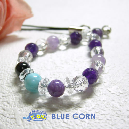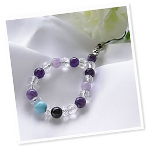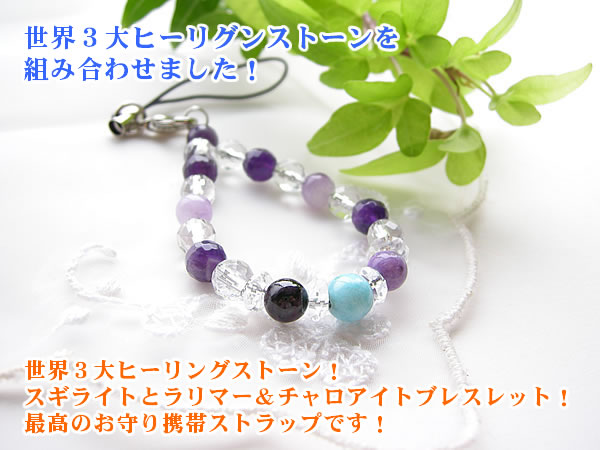 世界3大ヒーリングストーン! スギライト、ラリマー、チャロアイトを 組み合わせた! 最高のお守り携帯ストラップです! ●スギライトについて 世界3大ヒーリングストーンのひとつと言われている 癒しのパワーストーン、スギライトは、 怒りや悲しみの感情を取り除いて浄化することによって 心の安定を与えてくれると言われています。 20世紀中に発見されたパワーストーンの中でも、 最も癒しのエネルギーを持つ石として 世界中のニューエイジやヒーラーの方々の間で 最も注目されているパワーストーンのひとつです。 ●ラリマーについて 世界でたった一箇所からしか産出されないという 希少価値の高いストーンです。 (ラリマーはドミニカ共和国の南部にあるバオルコ (Baoruco)の鉱山から産出) 海のような淡いブルーが持つ人の心を癒し どこともなく優しさの風が吹いてくるようです。 ラリマーは愛と平和の石といわれ、 持つ人の怒りの感情を鎮め、 優しさと親切心で心を満たしてくれる石とも 言われています。 ●チャロアイトについて 世界3大ヒーリングストーンのひとつと 言われている、紫色のチャロアイトは、 不安な心を乗り越えて、自立心を高め、 強いヒーリング効果を持ち、精神を安定 させてくれるパワーストーンと言われています。