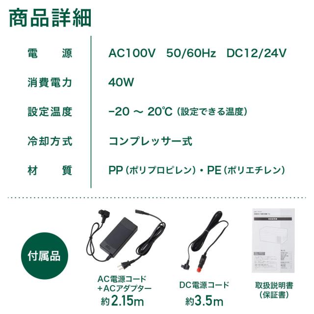 付属品:冷蔵庫本体、AC電源コード、DC電源コード、取扱説明書(日本語・英語版)