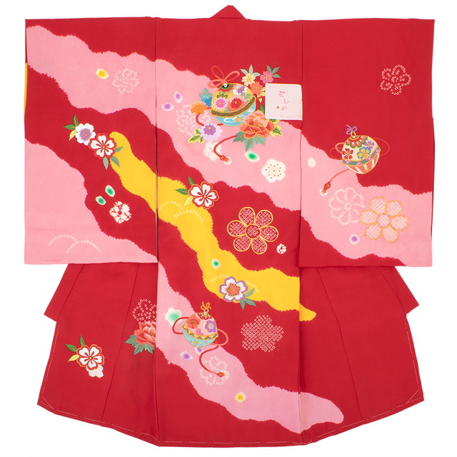 初着 赤 レッド 牡丹 桜 菊 梅 鹿の子絞り 桶絞り よろけ縞 刺繍 金駒繍 正絹 産着 うぶぎ 祝着 お宮参り お祝い 女の子 女児 ベビー 日本製