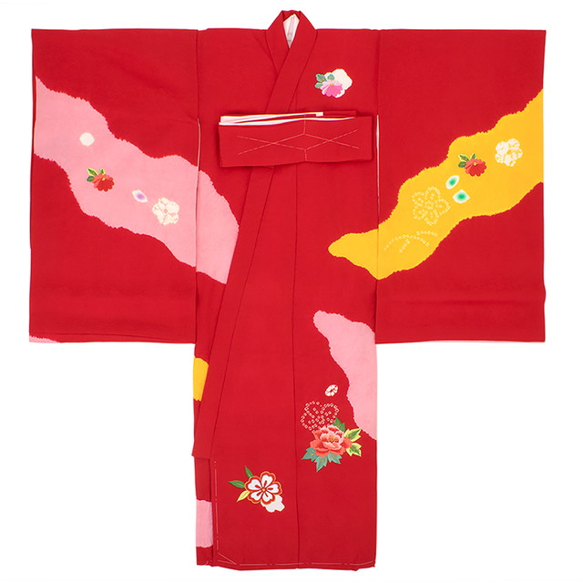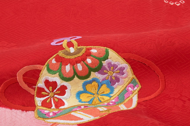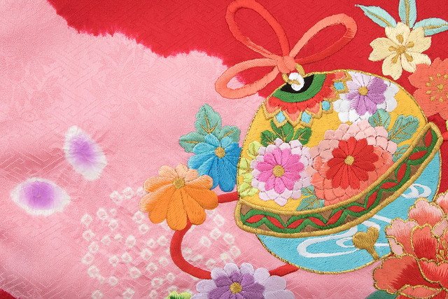 桜紗綾型の織柄の綸子生地に、可憐な牡丹や菊に桜や手鞠の刺繍、鹿の子絞りの桜は金駒繍で縁取られ、鹿の子が浮かぶ流水のようなぼかしのよろけ縞は桶絞り染められた豪華な意匠です。