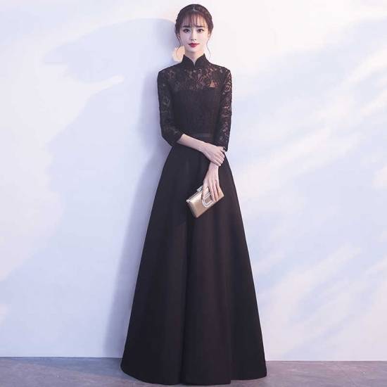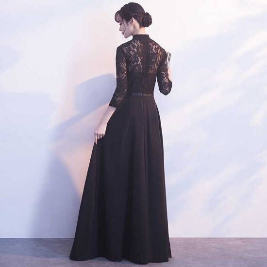 ロングドレス 黒 パーティードレス 春夏 お呼ばれ 大きいサイズ 30代 マキシ丈 半袖 袖あり ハイネック レース 花柄 刺繍 Aライン