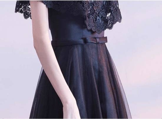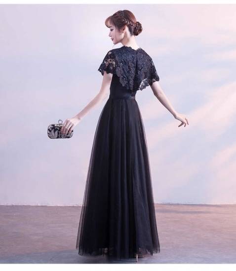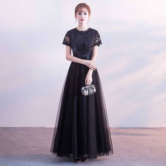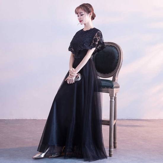 即納あり ロングドレス 黒 パーティードレス 春夏 結婚式 大きいサイズ 30代 マキシ丈 半袖 袖あり ラウンドネック レース 花柄 刺繍 Aライン