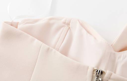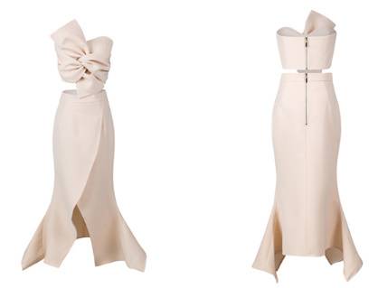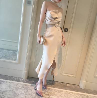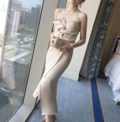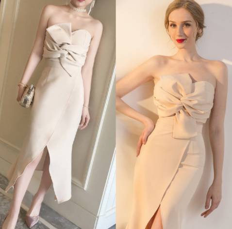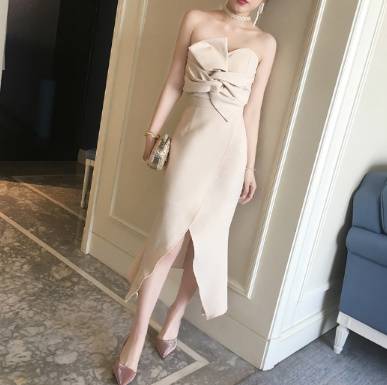 パーティードレス 春夏 結婚式 30代 ロング丈 ベアトップ 無地 リボン タイト Iライン スリット フェミニン セパレート ベージュ