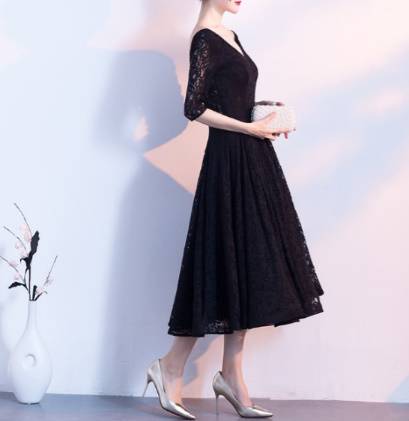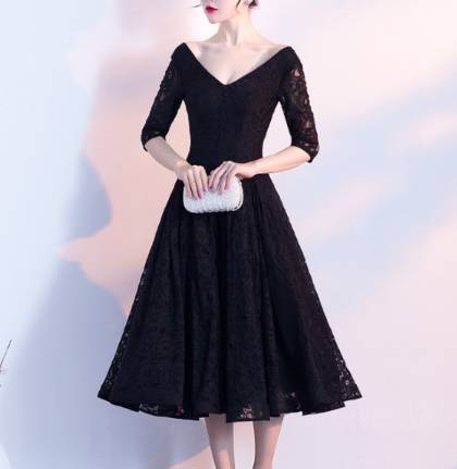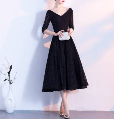 黒 袖あり パーティードレス ワンピースドレス ワンピース ドレスワンピ お呼ばれドレス イブニングドレス 二次会 お呼ばれ デート 同窓会 謝恩会 食事会 ブラック 大きいサイズ ミモレ丈 5分袖 フレア Aライン レース 総レース シースルー Vネック 20代 30代 40代 50代