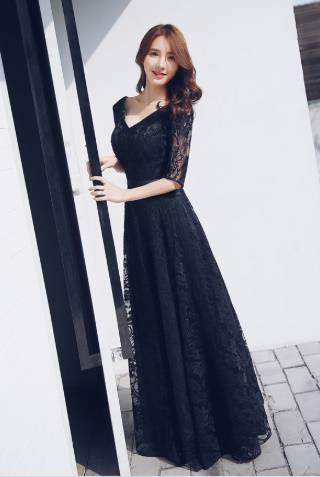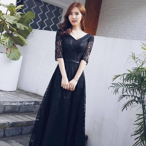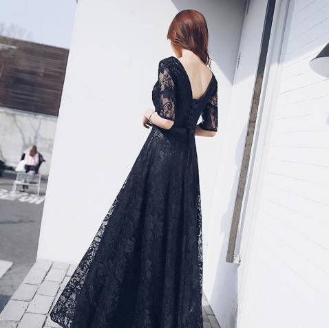 ロングドレス 袖あり 黒 演奏会 パーティードレス お呼ばれドレス イブニングドレス 二次会 お呼ばれ 同窓会 音楽会 食事会 ゲスト ブラック 大きいサイズ マキシ丈 5分袖 Aライン フレア レース 総レース シースルー 透け感 20代 30代 40代 50代 Vネック エレガント 上品