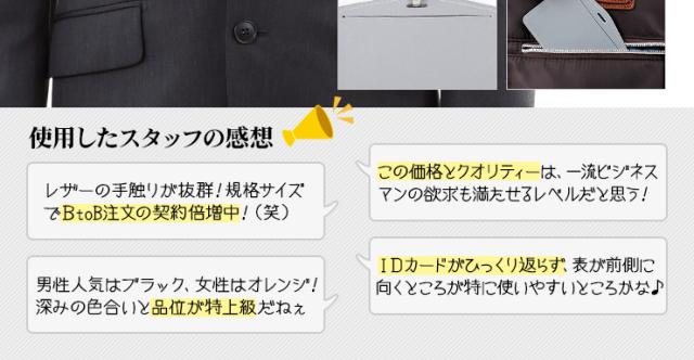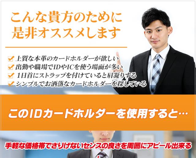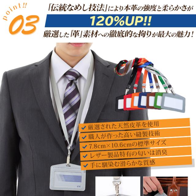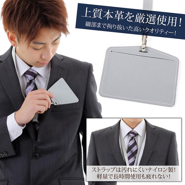 本革仕様&パステルカラーのお洒落な社会人用に制作された「革職人シリーズ」の商品です。 IDカード導入企業も増え続ける昨今の日本社会!会社の入退出用、オフィス毎や部署単位でのセキュリティ管理としてカードフォルダーは必須アイテムです!大切なカードはフォルダーに入れて首にかけて持ち歩く!今やオフィスワークの定番スタイル!通勤時や会社内の入退出で今や必須のカードホルダー!スーツや仕事着だけじゃなく、革鞄や革小物にもこだわる20〜40代には手頃な価格なカードケースをお探しの方も多いはず。これさえあれば、朝夕の自動改札での通過がスムーズ、毎日の通勤を快適にサポートいたします。本革のカードホルダーにストラップはナイロン製!意外と革のストラップよりもお手軽で実際に着用してみると軽くて首にフィットするナイロン製のストラップが使い勝手が良いものです。牛革は、長く愛用すれば、その時間に比例して本革の風合いが熟成し、愛着が滲み出てきます。毎日の必需品だからこそ、手に持って革の変化を確かめるのが愉しく素敵なアイテムです!キーワード:ファッション小物 IDカードケース