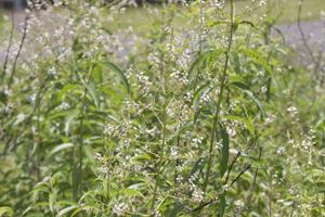 夏に枝先に小さな白や紫色の花を咲かせます。