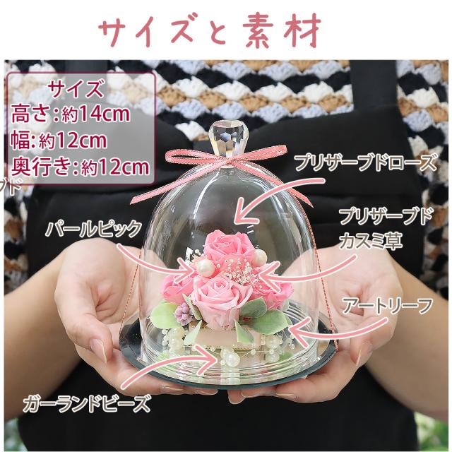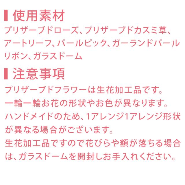 素材:プリザーブドローズ、カスミ草、アートリーフ、パールピック、ガーランドビーズ、リボン、ガラスドーム(底面ミラー)