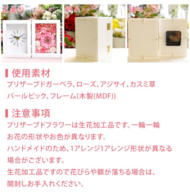 素材:プリザーブドガーベラ、プリザーブドローズ、アジサイ、カスミ草、パールピック、ラインストーン、時計(木製(MDF)/表面にアクリルカバー)、電池(動作確認用)