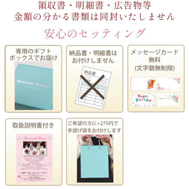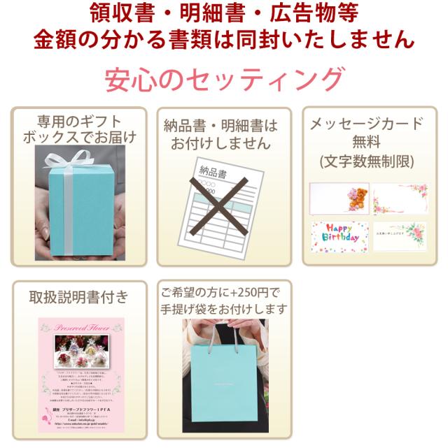 - 母の日のプレゼントとして購入しました。 注文してすぐに出荷準備、発送の通知が来てとても驚きましたが内容通りのしっかりとしたかわいいハーバリウムが届きました! 対応も早く、途中経過もメールで知らせてくれ...