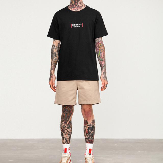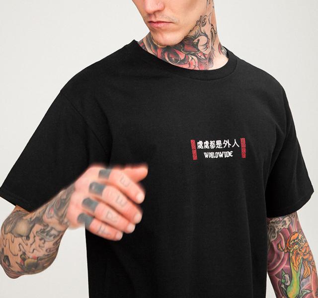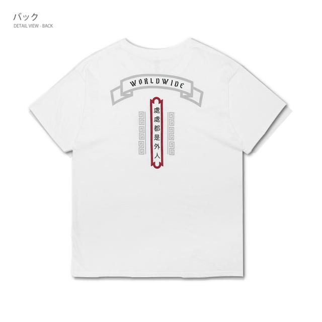 胸部に小さなロゴ 背中に大きく特徴的なロゴを配したTシャツ