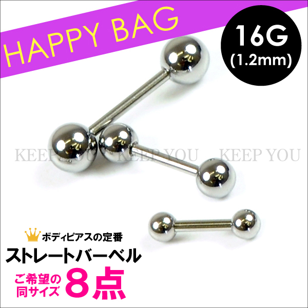 【メール便対応】【8個セット福袋】ショート ストレート バーベル 16G(1.2mm) サージカルステンレス316L(医療用) ボディーピアス 定番 ファーストピアス 16ゲージ お得セット┃
