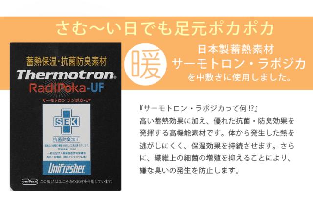 日本製蓄熱素材サーモトロン・ラジポカを中敷きに使用しており寒い日でも足元ポカポカ♪