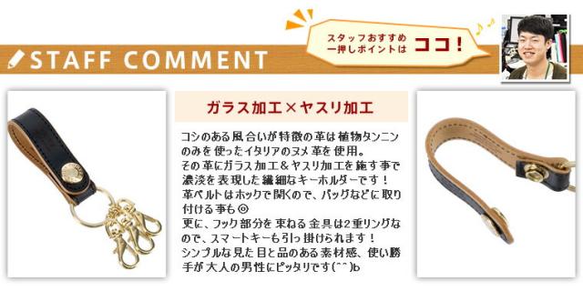 特徴的な凹凸のあるショルダー革にガラス加工+ヤスリ掛けをした、濃淡のある豊かな表情が自慢のキーホルダー。