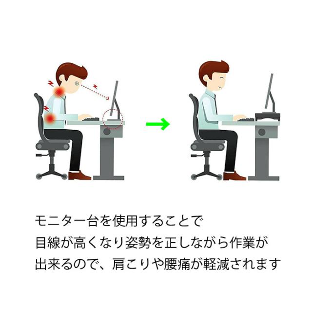 ・モニター台を使うことによって、視線が自然に上がり、背筋が伸びるようになり、猫背になるのを防ぐことができます。良い姿勢を保つことで、楽に作業することができ、首こりや肩こりになりにくい!
