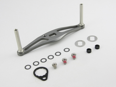 ハンドル本体1ヶ、シマノノブ用樹脂カラー2ヶ、リテーナー1枚、 Ti64スクリュー(リテーナー固定用)1ヶ、ハンドルノブ固定用ビス(+ナベビス)2ヶ、ハンドルワッシャー2枚、調整ワッシャー6枚(ハンドルノブに「ガタ」がある場合にのみ入れて調節してください)。