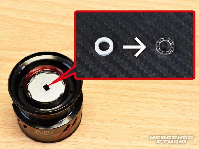 18タトゥーラのスプールシャフト部に装着されているプラスチック製リングをベアリングに交換してドラグ性能を向上させることができます。