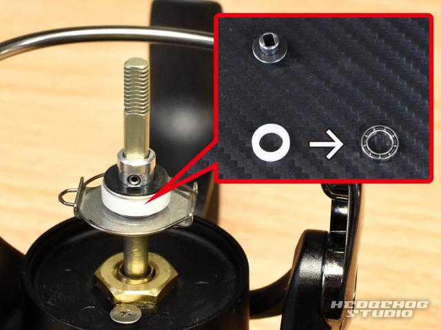18タトゥーラのハンドルノブ内にあるプラスチックカラー2個をベアリングに交換します。