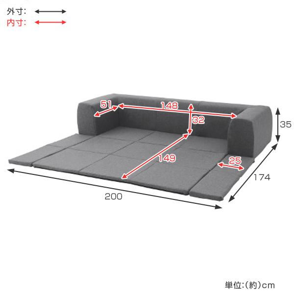 | サイズ | 約 幅200×奥行76×高さ34.5(cm) 【ソファ時】 サイズ:約 幅200×奥行76×高さ34.5(cm) 座面高:約 9(cm) 【マット時】 約 幅200×奥行174×高さ34.5(cm) 座面高:約 3(cm) |