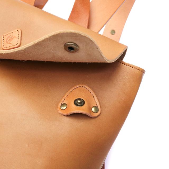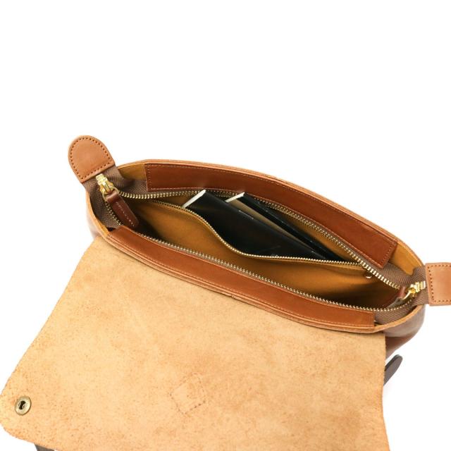 メインルームはA5サイズがピッタリ収まる小ぶりなサイズ感。マチ幅が適度に設けられお財布や、ポーチ、ハンカチなどのお出掛けに持ちたいアイテムはしっかり収まります。また、フラップを留めるスナップボタンは、指をかけやすいレザーパーツ付きになっており、使いやすく本体を傷つけにくい工夫が施されています。