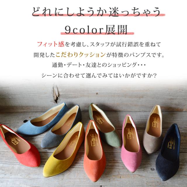 どれにしようか迷っちゃう9color展開。フィット感を考慮し、スタッフが試行錯誤を重ねて開発したこだわりクッションが特徴のパンプスです!足の動きに合わせてフィットするので、脱げにくく靴擦れしにくい!足当たりの良いふわさら素材はふんわり沈み込むようなやわらかさが心地よい◎