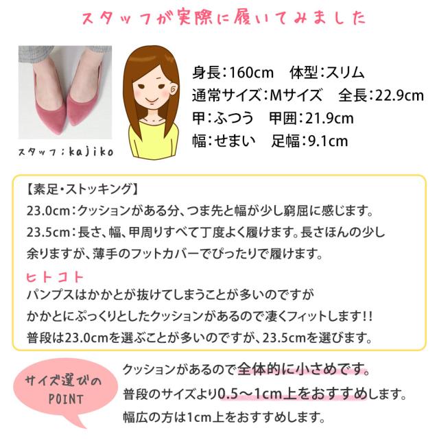 ★いつもは23.5cmですが、この靴はかなり小さいので24.5cmがちょうど良かったです。素足やストッキングでは少し大きく感じますが、フットカバーを履くので24.5cmを選びます。