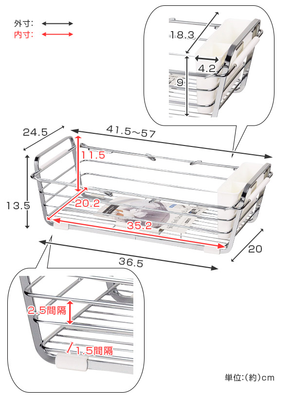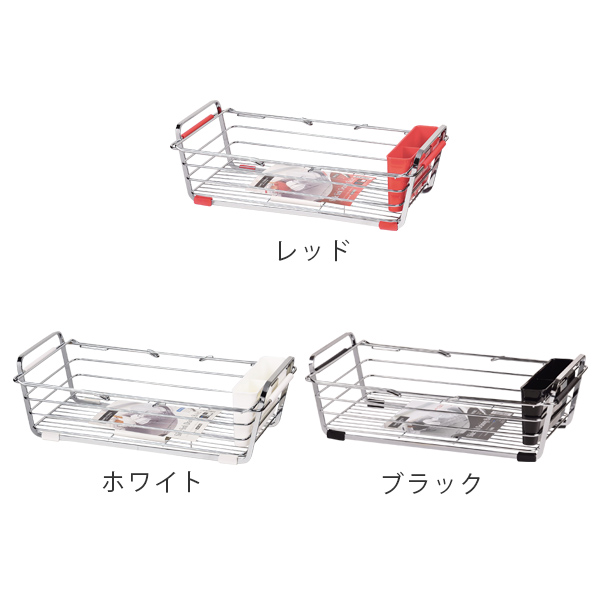 伸縮水切りラック シンプルストレージ スライド式シンク水切りバスケット レッド ( 水切りカゴ 水切りかご 水切りバスケット 伸縮式 伸縮水切りカゴ カトラリーポケット付き 水切りラック シンク上 水切りラック 伸縮)
