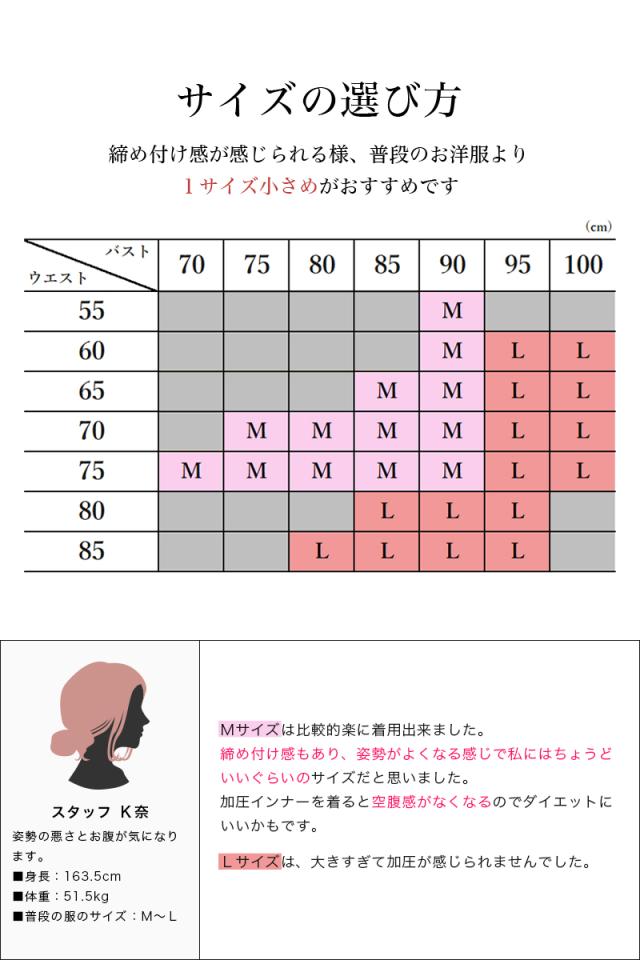 - 最初着るのに四苦八苦しましたが(見栄を張りワンサイズ下をチョイスしたため?)、つけ心地悪くなく適度な締め付け。 中々に良い。 背中のお肉もカバー出来ました。 胸も苦しすぎず押さえられ、ハードな仕事で...