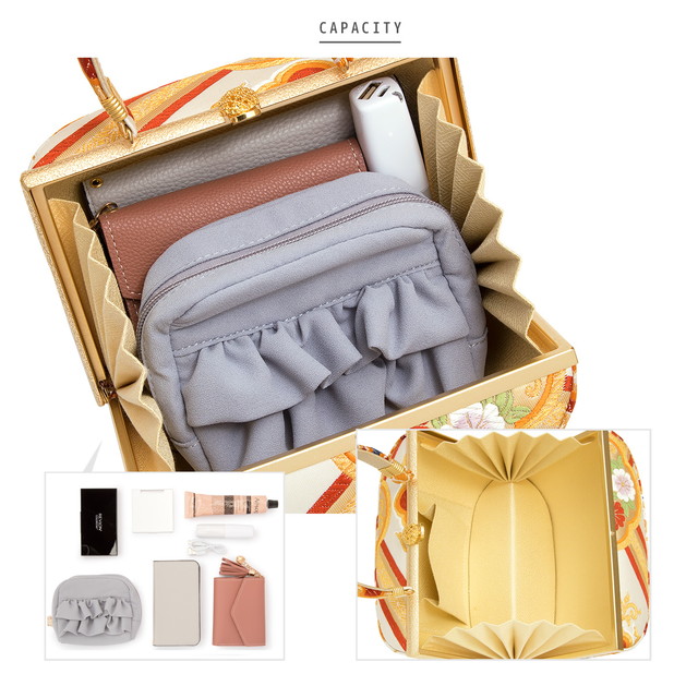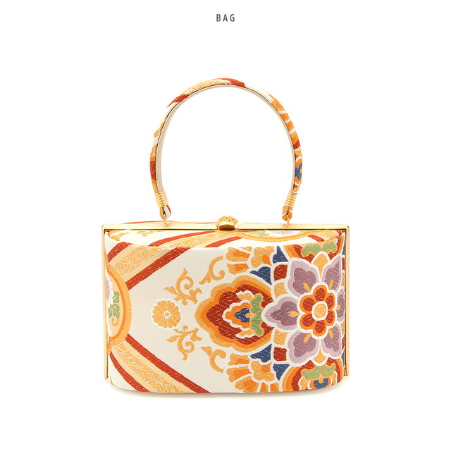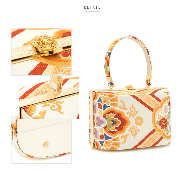 バッグと草履の鼻緒には、上品で高級感のあるキラキラと輝く金色糸で稜花唐草や菊花唐草、格子には桜が配された古典の華やかな意匠です。