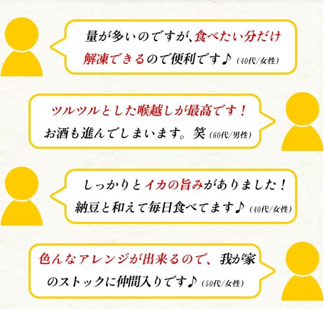 鮮度の良い国産原料のみを厳選し、独自技術で極細カットしました!旨みと食感をちょうど良く感じられる、こだわりのカット幅は「2.5mm」。 旨み・食感を最大限に引き出しておりますので、イカ本来の味を存分にお楽しみいただけます♪1柵ずつ丁寧にフィルムに包んでいるので、食べたい分だけ解凍できるのも魅力です!そのまま食べるのはもちろん、明太子・納豆などと和えるのもおすすめ♪